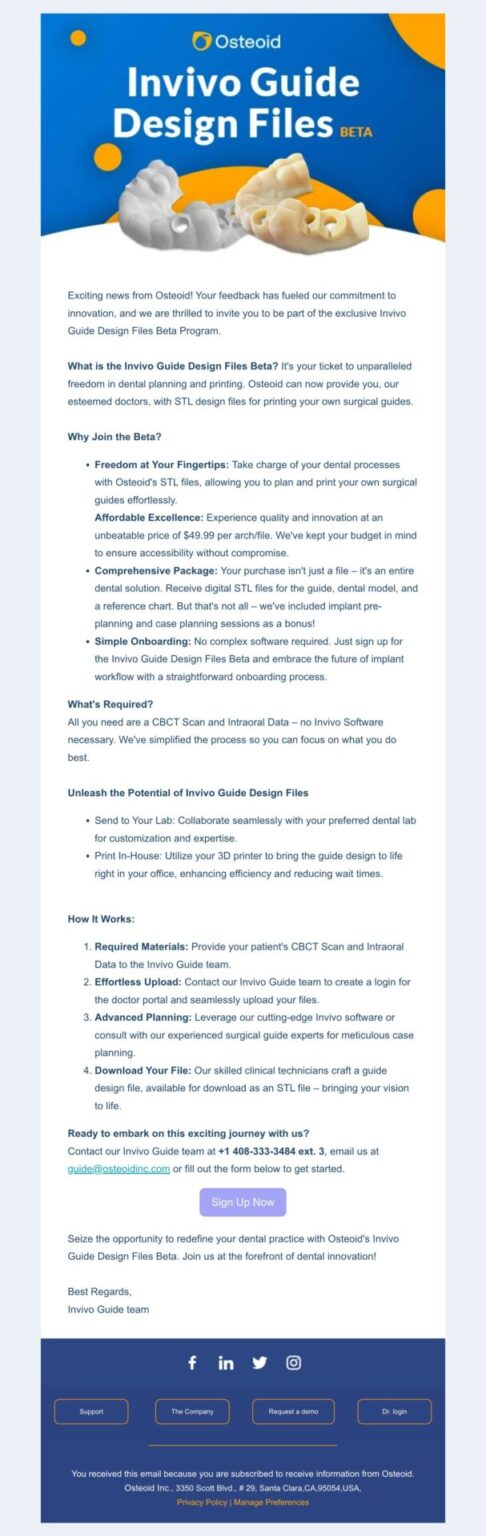 This campaign promoted Invivo Guide Design Files by highlighting the ability to export .stl files easily for in-house or lab printing, while continuing to plan, design, and collaborate seamlessly within the Invivo software. Through workflow-driven messaging and practical use cases, the initiative positioned Guide Design Files as a flexible, efficiency-boosting solution that expanded production options without disrupting existing clinical processes.