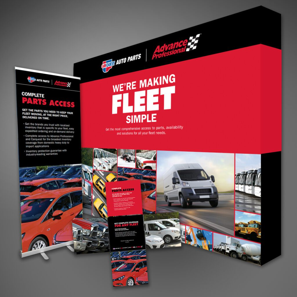 A selection of brochures, trifolds, tradeshows booths, and planogram signage